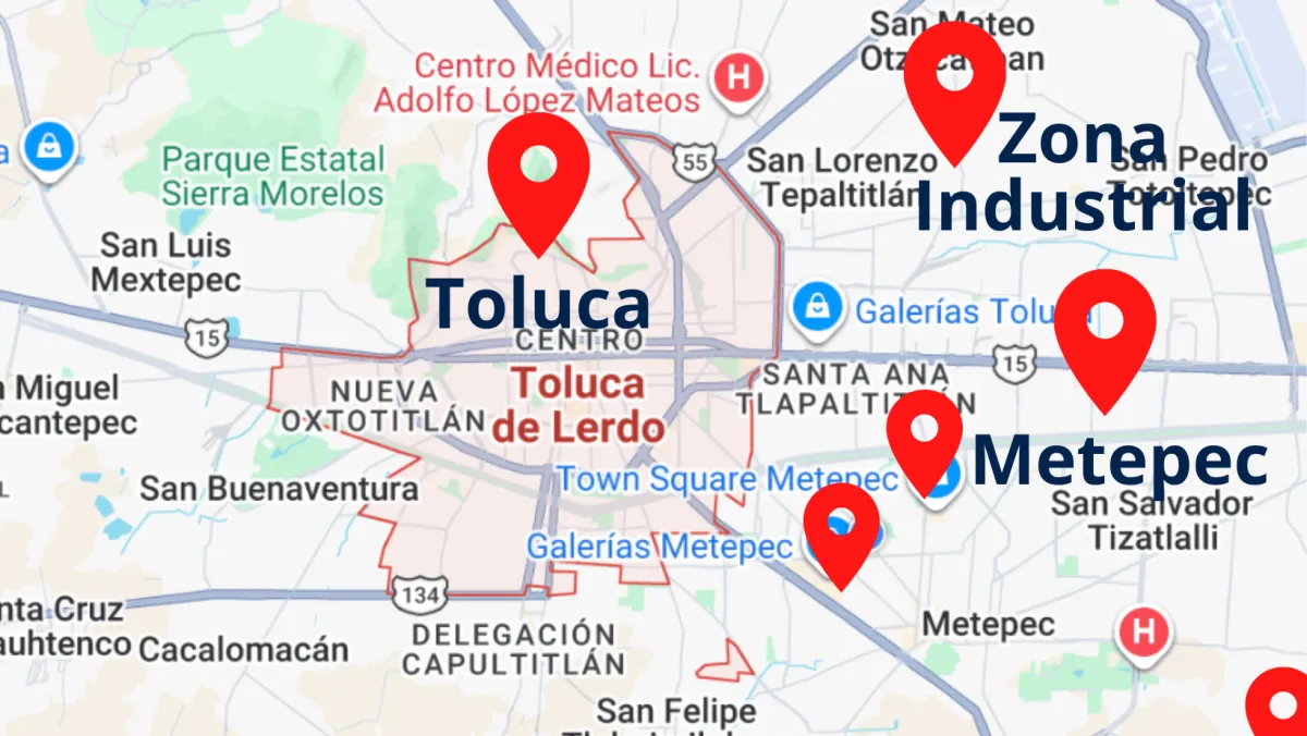 Las propiedades están ubicadas en zonas estratégicas de Toluca y Metepec, cercanas a plazas comerciales como Galerías Metepec, Town Square Metepec, zonas industriales y vialidades principales como las Torres, Tolloca, cerca de las estaciones del Tren Interurbano México Toluca, priorizando seguridad y cercanía al lugar de trabajo.